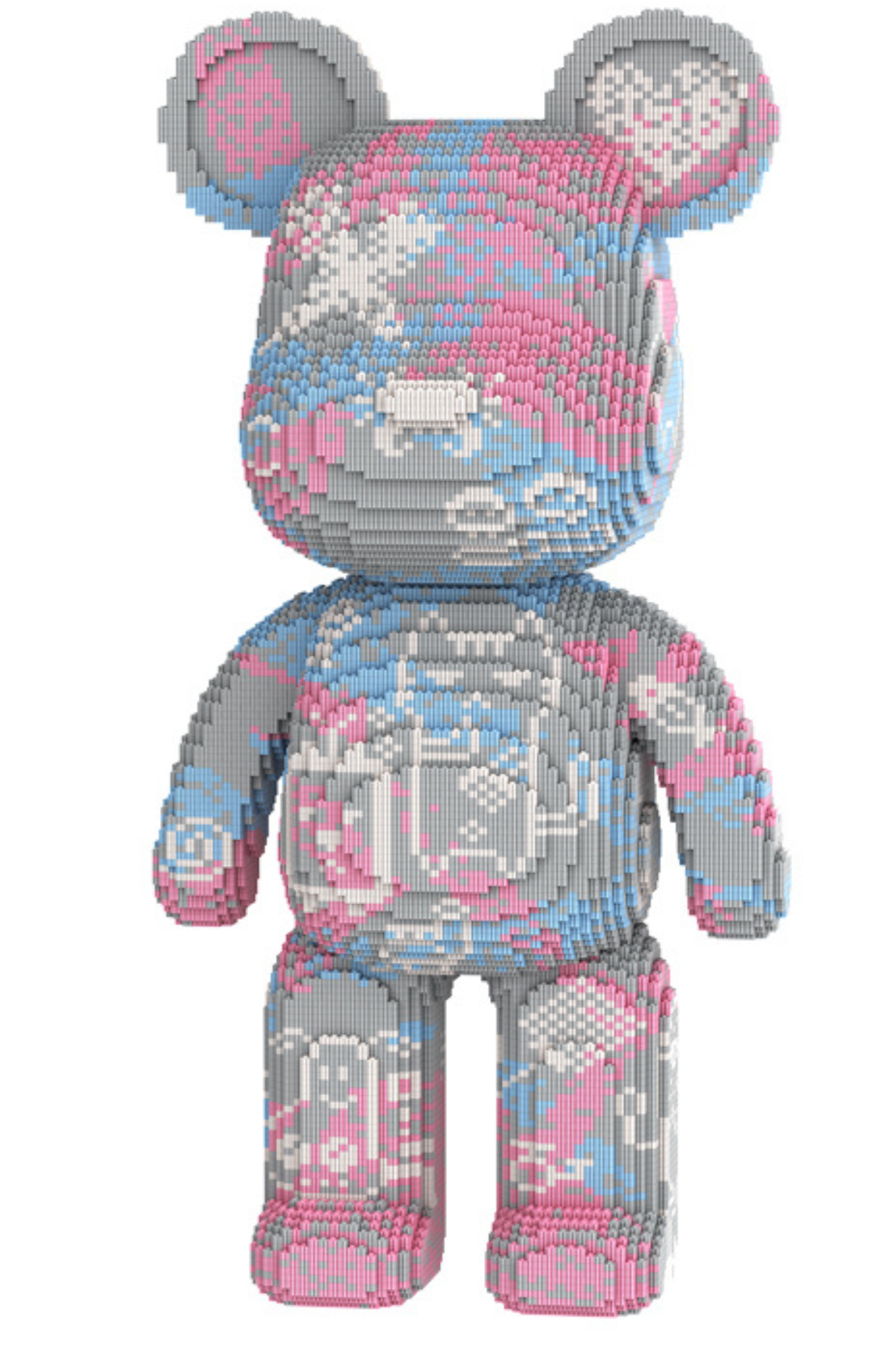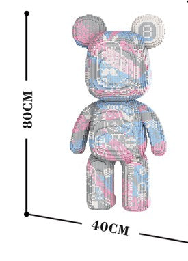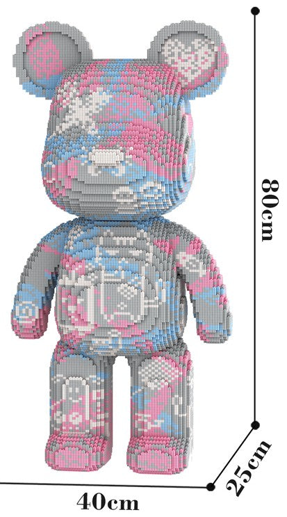Dieser 80 cm große Teddybär aus hochwertigen Klemmbausteinen in grau, pink und blau mit Tiermotiven und seinen vielen witzigen Details ist ein einzigartiges Bauprojekt, das Spaß und Kreativität vereint.